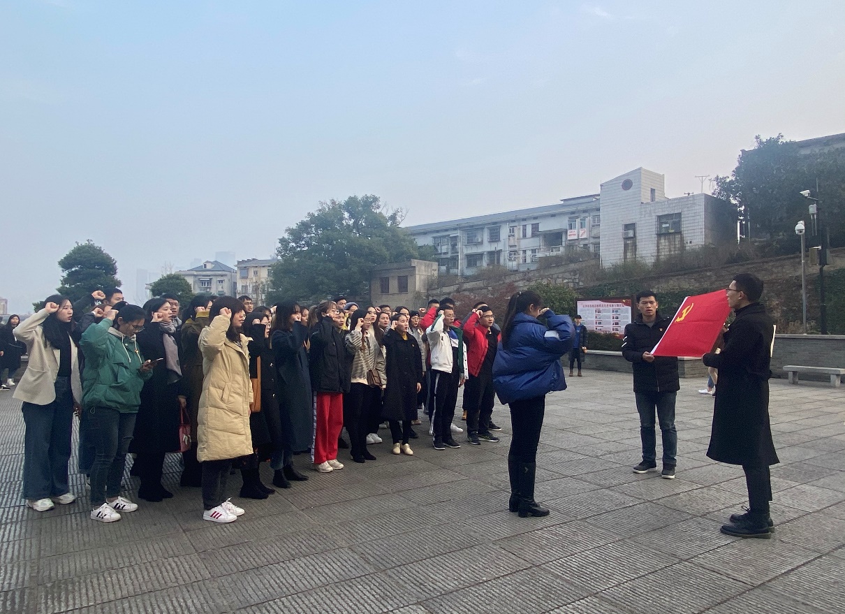 所有预备党员及党员进行宣誓。由艺术设计研究生支部张珺同志宣布参加宣誓的预备党员名单,参加宣誓的预备党员站在前列,党员站在后列,面向党旗,举右手(握拳过肩)宣誓。工科与职教研究生党支部彭玮祯书记领读誓词宣誓。