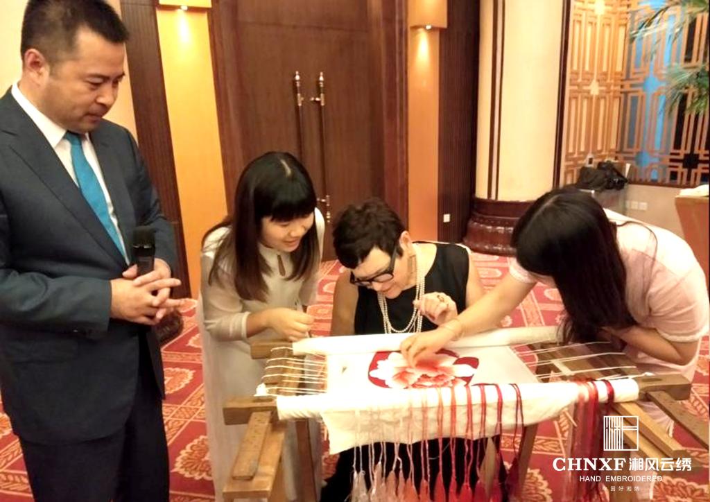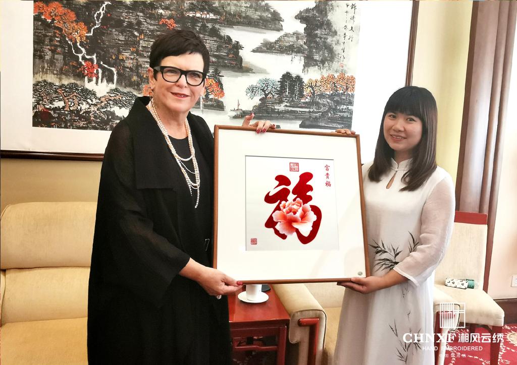 期间,珍妮·希普利在听过肖瑛对湘绣的介绍后,盛赞湘绣之美。她兴致勃勃坐到织机旁,亲身体验了湘绣制作技艺,并将湘绣国礼《牡丹福》收藏。