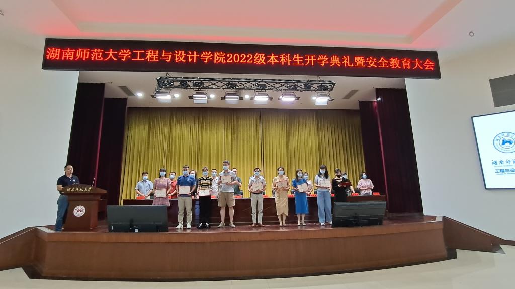 在主席台就座的学院领导为新生班导师颁发聘书。开学典礼结束后,学院组织对全体新生进行安全教育。