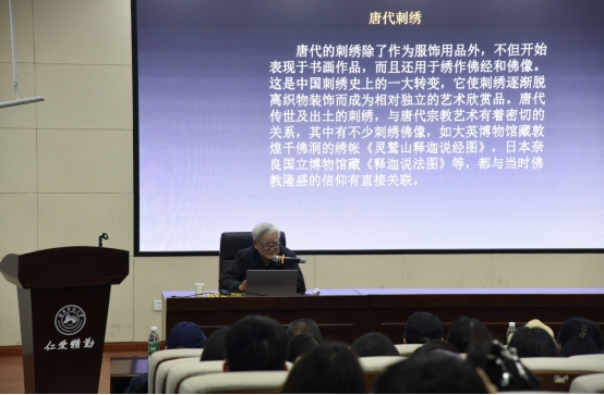 围绕“十指春风 巧艺如神——中国刺绣艺术源流”这一主题,孙老师通过介绍中国历代的刺绣艺术与绚丽多姿的刺绣纹样,向大家展示刺绣艺术源远流长的历史与精湛的刺绣针法。他以刺绣技艺的保护与传承以及刺绣针法中所体现的灵巧与智慧为例,说明“刺绣针法的意义”亦即“技与艺的关系”或“艺与道的关系”。