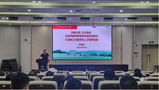 院长林海军做新学年工作报告,他分析了学院现状,指出了存在的问题,并提出了未来发展思路,提出要通过创新引领,交叉融合,夯实职教师资培养传统优势地位,将学院打造成新工科新艺科人才培养高地。