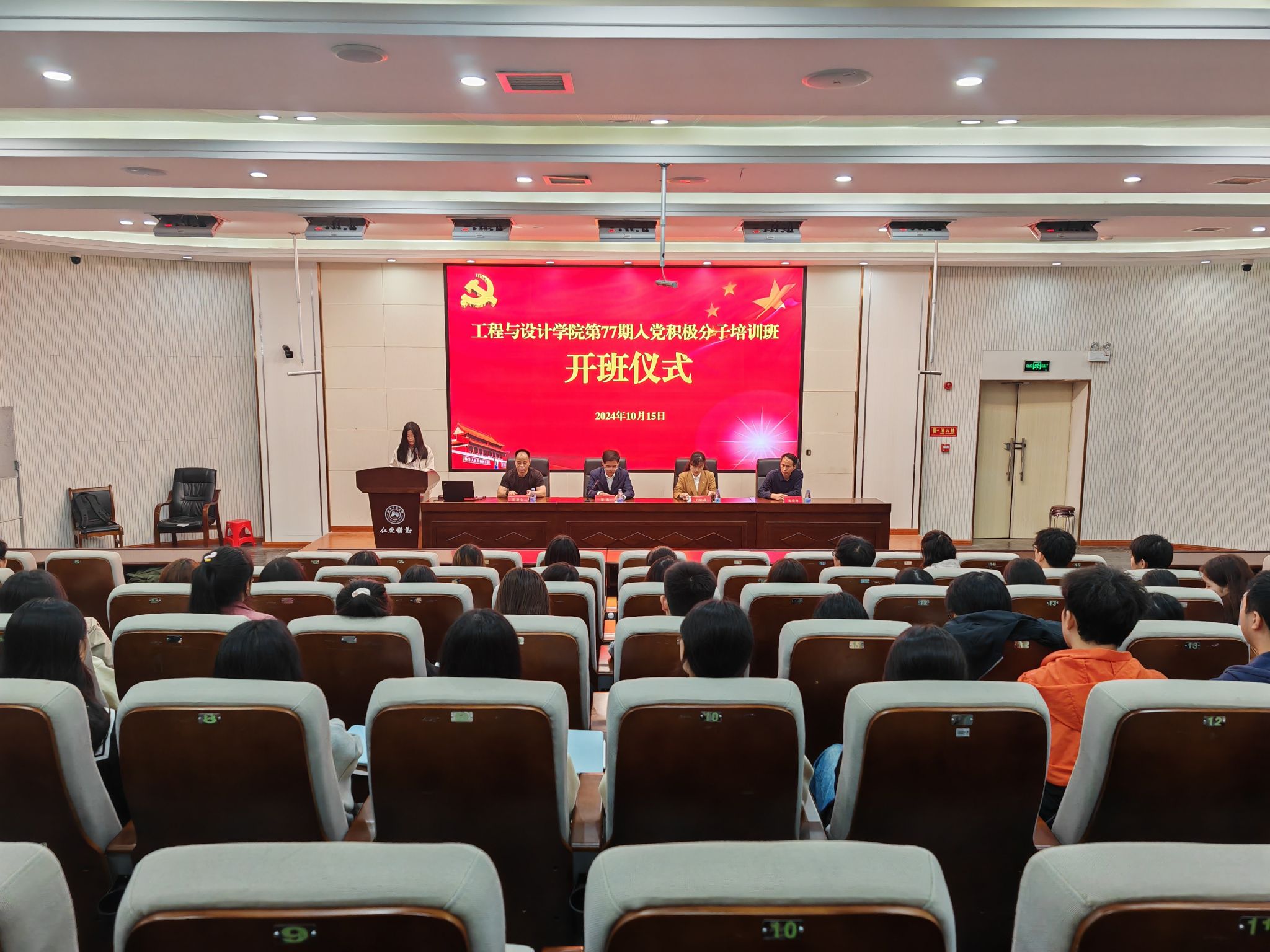 学院科研与研究生办主任庞爱卿,学工办辅导员申梦博、邓萍及第77期共77名入党积极分子参加开班仪式。