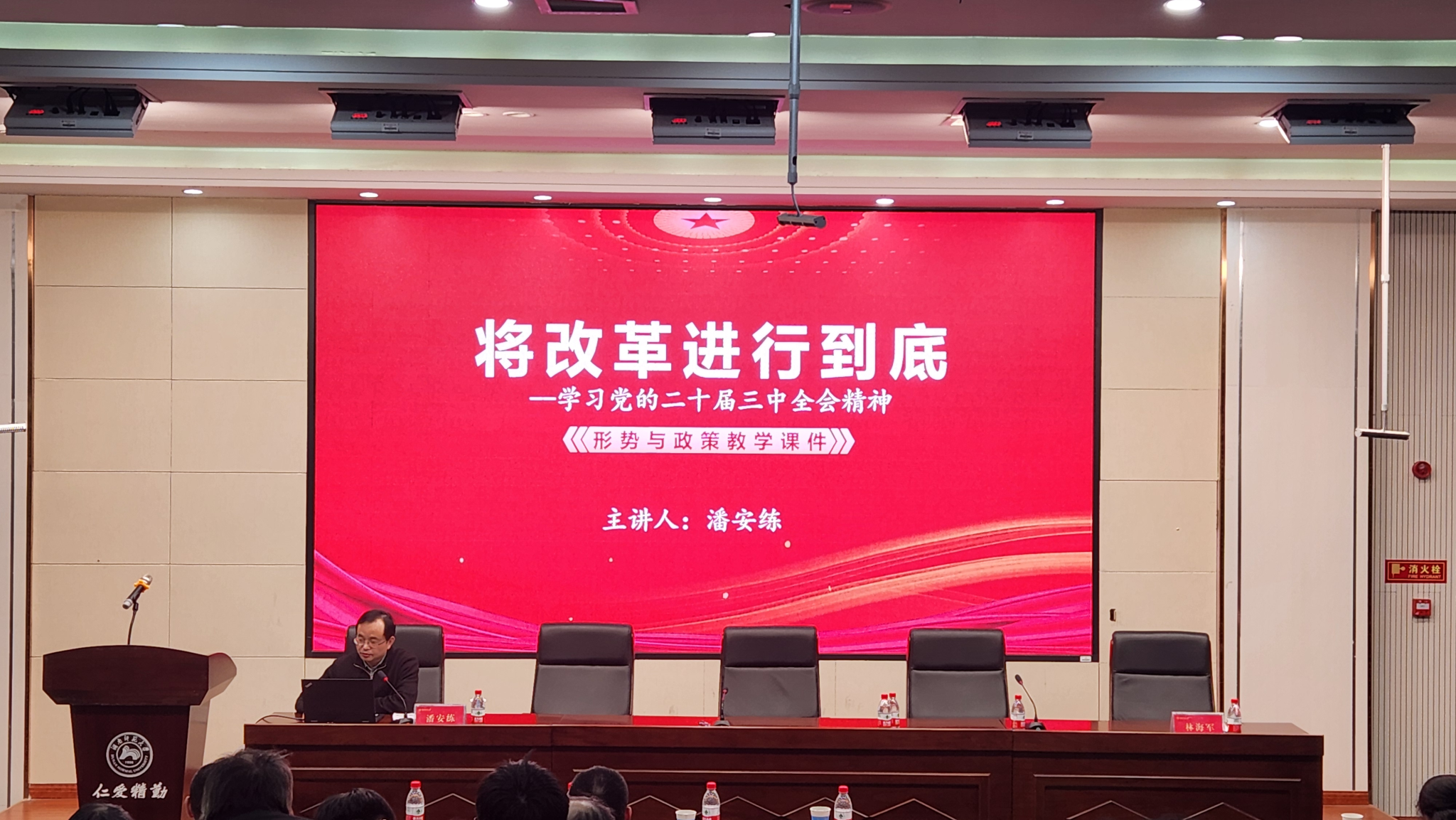 (通讯员:申梦博)12月19日下午,我校潘安练副校长受邀为学院全体教职员工和本科生代表宣讲党的二十届三中全会精神暨讲授形势与政策课程。学院党委书记梁勇主持。