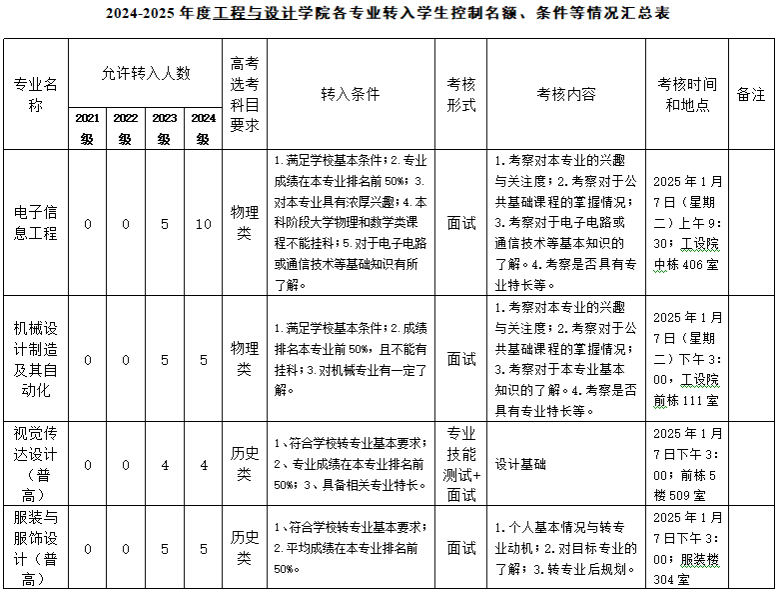 根据学校工作通知,结合我院的教学资源、师资力量及学生需求等实际情况,经过广泛征询各系及专业意见,并通过党政联席会议讨论确定,2024-2025年度我学院上述专业可接收转入学生的名额及其转入条件、考核形式、考核内容、考核时间和地点等参见下表。