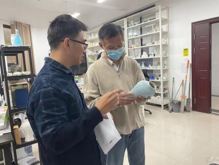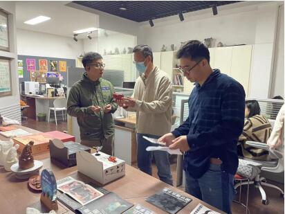 张继雷教授参观陶艺工作室,与王贞副教授交流讨论。王贞副教授向张继雷教授介绍陶瓷3D打印创新设计产品,与张继雷教授讨论基于材料颜色、材质、触感的陶瓷产品设计研究。