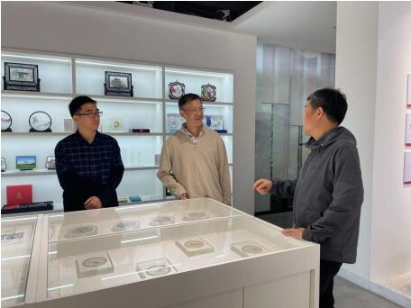 张继雷教授参观湘绣创新研发中心,孙舜尧教授表示湖南湘绣非遗产品的保护、推广与开发需要与新材料、新科技相结合,从而脱离单纯文化基因采集的发展模式,取得形式上的突破。张继雷教授建议从吸音材料与湘绣装饰画相结合的声学产品开发,透明木材等新型环保材料取代高分子透明材料在湘绣包装的应用研究展开合作与交流,发挥各自学科优势,推动资源共享,开展深度合作。