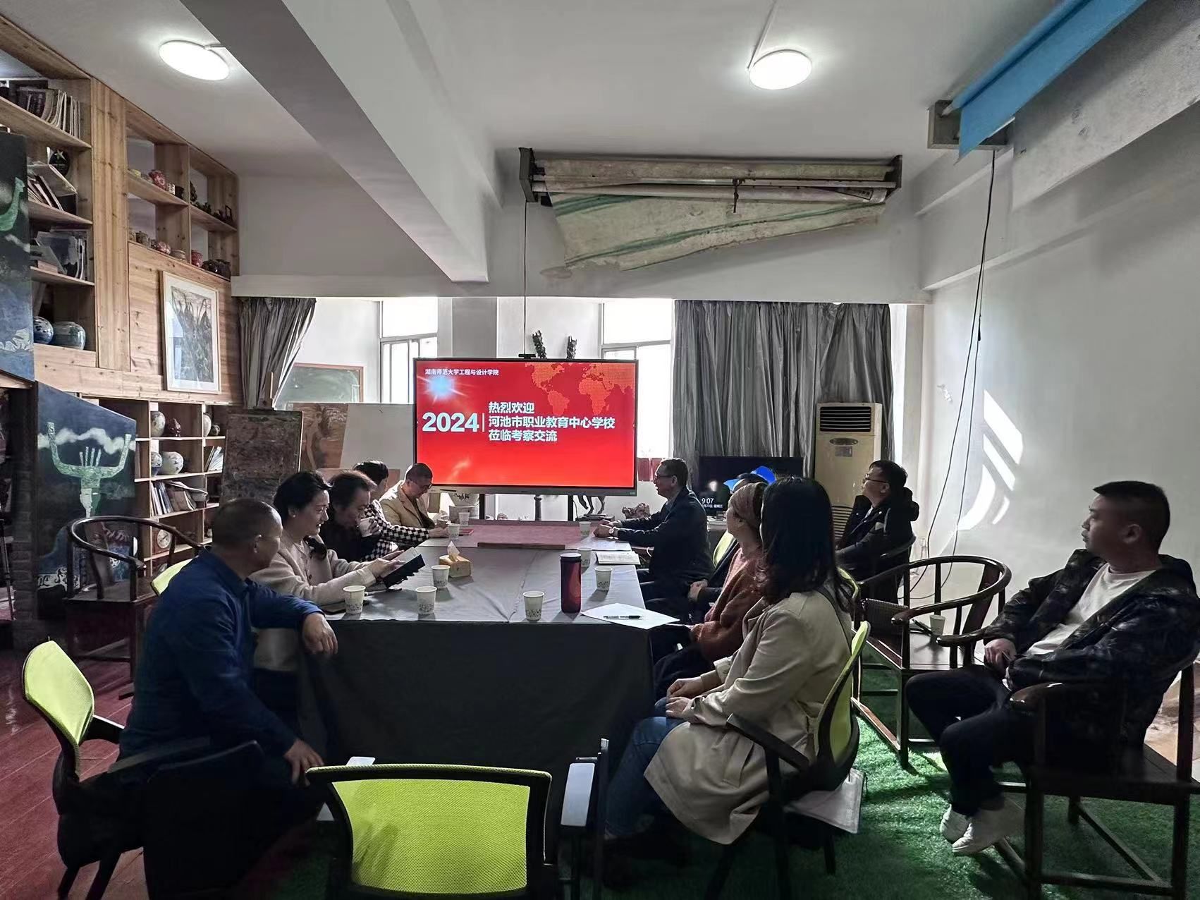 谭冠著介绍了河池职业教育中心学校的基本情况。双方就中职教育发展困惑、非遗传承保护如何进入中职教育以及教育教学、校企合作等问题进行交流探讨。