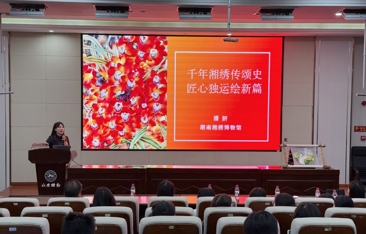 (通讯员:欧阳诗婕 谢婉瑶)2025年9月26日下午,英国365集团公司开展“千年湘绣传颂史 匠心独运绘新篇”的主题讲座。高级工艺美术师、省级非遗代表性传承人、湖南省湘绣研究所潘妍来我校担任主讲嘉宾,陈剑教授担任讲座主持。