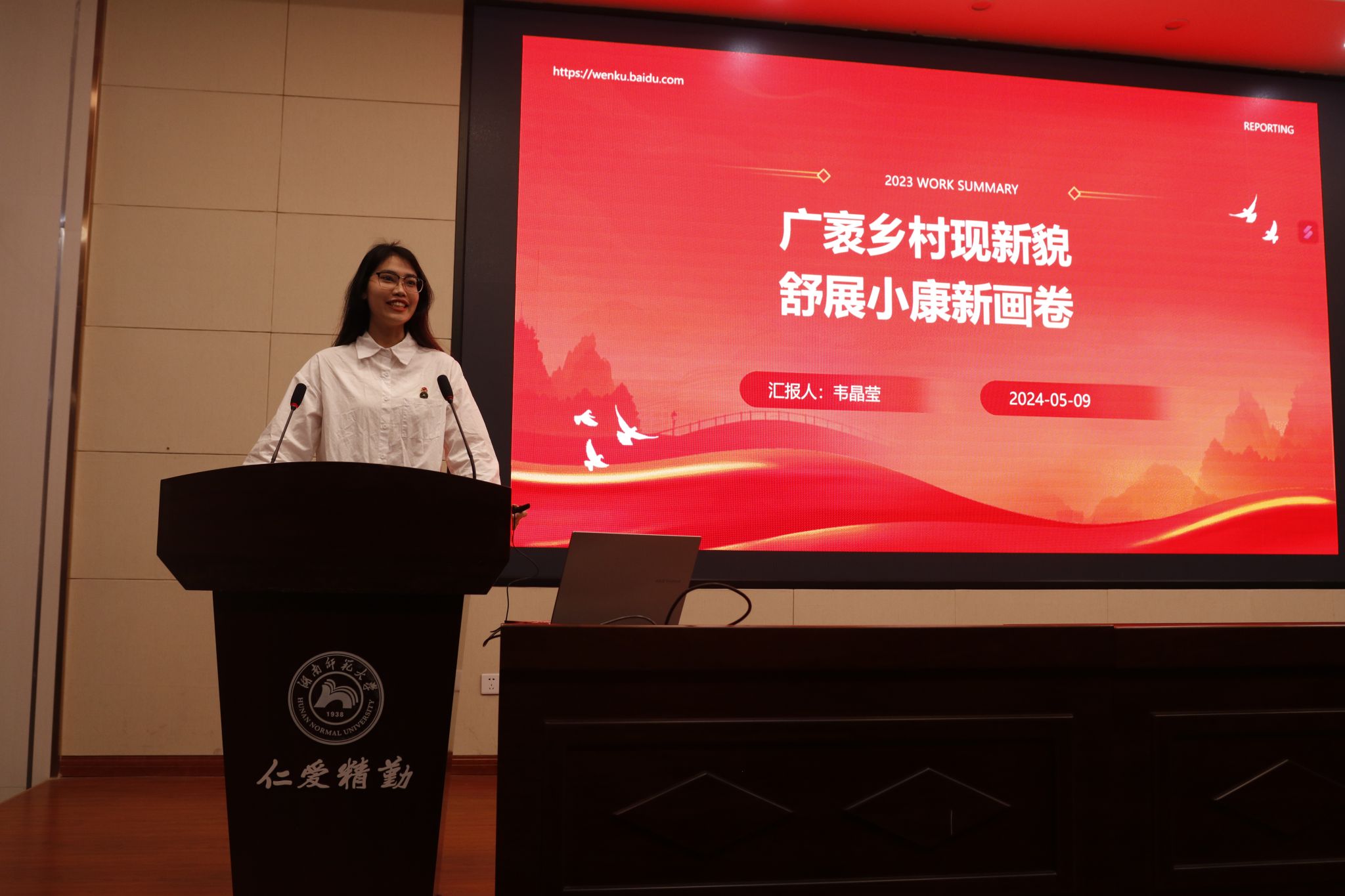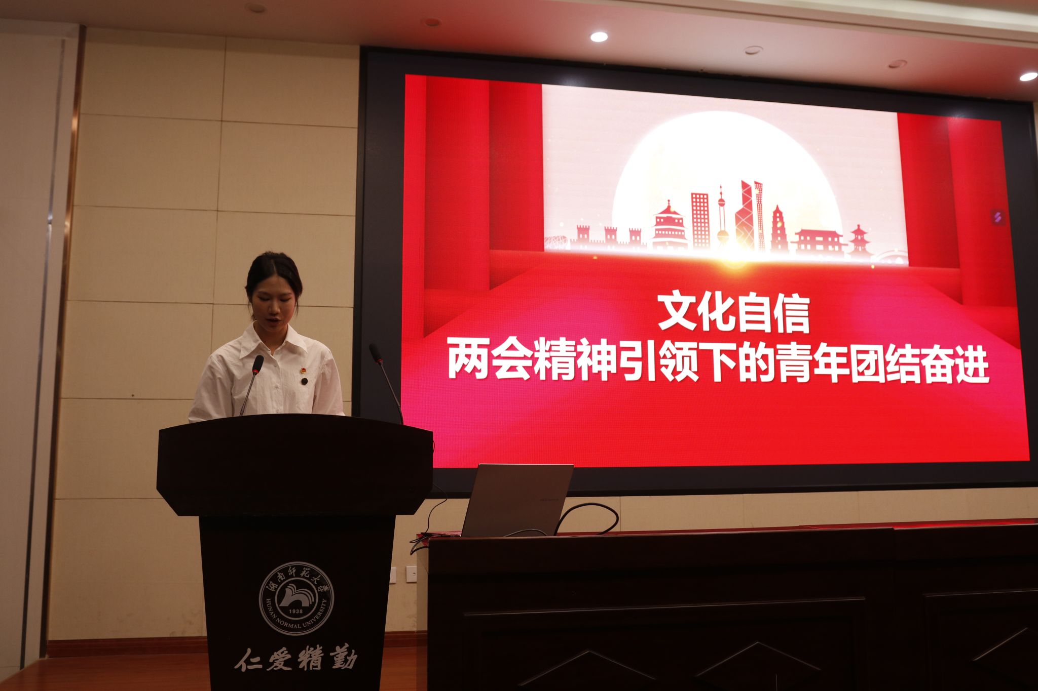 5位主讲人分别从不同角度切入,阐释自己对2024全国两会精神的理解和思考。2022级服装与服饰设计专业李婷阐述了职业教育大有可为、大有作为、大有所为的新面貌,鼓励我院青年学生特别是职教师范类学生,更应以昂扬的姿态和卓有成效的业绩,共绘职业教育新图景。2023级表演(服装表演)专业韦晶莹用十八洞村的脱贫故事告诉我们青年是推进乡村振兴的生力军,要向全国乡村振兴青年先锋学习,共同谱写时代奋进最强音。2021级视觉传达设计专业石荣榕从法治建设的角度出发,告诉同学们落实两会精神,需要昂扬取进的信心、向“新”而行的决心、坚韧不拔的的恒心。2022级服装与服饰设计专业曾媛媛讲述了她暑期社会实践活动的经历,鼓励青年为乡村教育贡献青春与智慧,让知识的力量在乡村生根发芽。2023级表演(服装表演)专业彭妍曦向听众展示我国丰富多彩的传统文化资源,向大家发出坚定文化自信、厚植家国情怀,以实际行动传承和发扬优秀传统文化的号召。