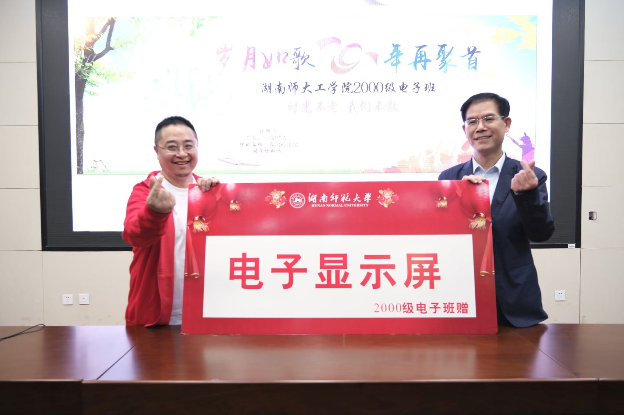 座谈会上,还举行了捐赠仪式,2000级电子班陈运贵代表全班校友向学院捐赠电子显示屏,梁勇接受捐赠。