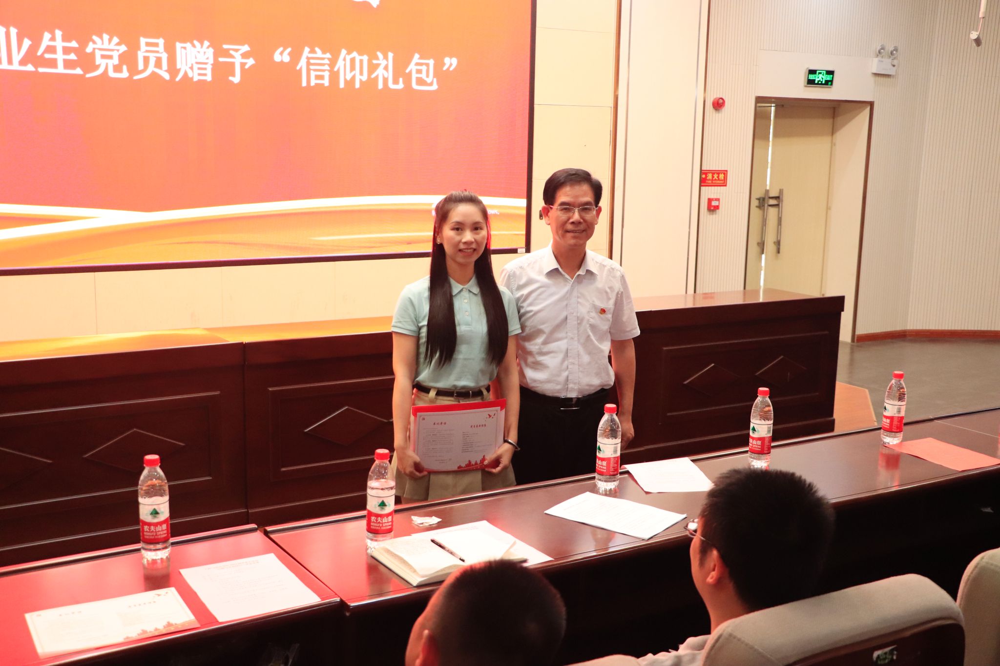 梁勇为毕业生党员代表赠“信仰礼包”。“礼包”里锃亮的党徽,提醒着毕业生党员永远铭记党员身份,不忘初心,践行誓言;《中国共产党纪律处分条例》一书提醒同志们认真学原文,心中有戒,行有所止;礼包里还有学院为毕业生党员一一做的《党员信息卡》,上面印制了党委书记的殷殷嘱托党员的重要身份信息;《党员组织关系转移注意事项》温馨提醒各位党员,严格按照党内组织生活原则,执行党的组织纪律。