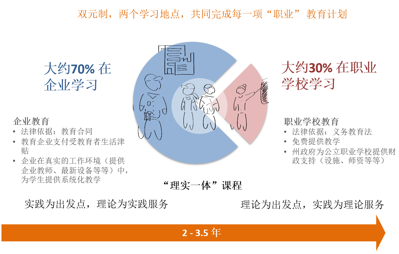 “双元制”的“双元”,主要意思是指学习者学习发生在企业和学校两个场所;同时,学习者既是学校的学生,也是受雇于企业的员工,他们与企业签订由行业协会提供的教育合同,并在行业协会进行登记,可以选择“培训职业”(training occupations)进行学习。