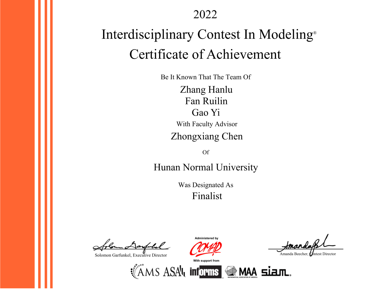 我院陈中祥、潘家骥老师指导的参赛队伍在2022年美国大学生数学建模竞赛与交叉数学建模竞赛(MCM/ICM)中荣获Finalist Winners(F)奖1项, Meritorious Winners (M)奖1项,Honorable Mentions(H)奖4项。